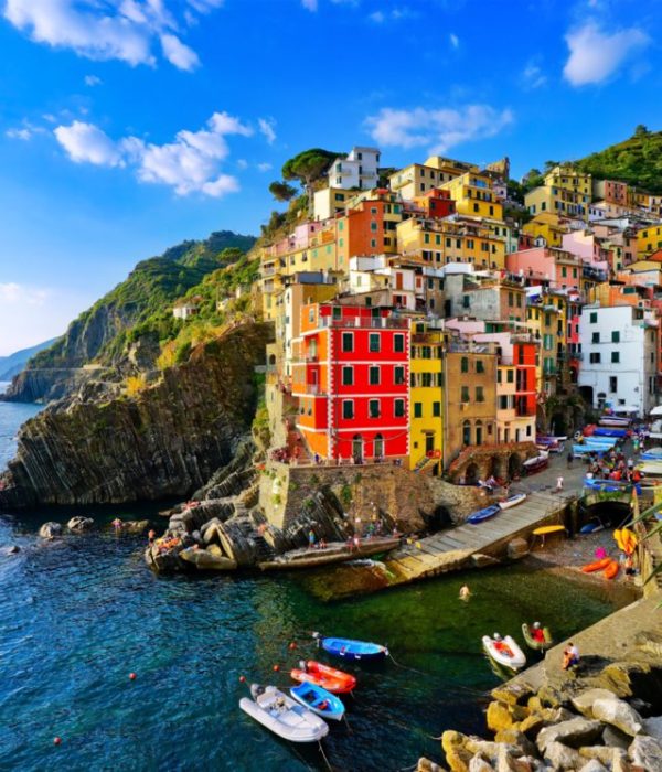 La prima delle Cinque Terre che si incontra, provenendo dalla stazione ferroviaria FS della Spezia, è il pittoresco borgo di Riomaggiore che si insinua tra due irte colline a terrazze. Scendendo al mare precipitosamente, questo antico borgo accoglie il visitatore con con un bel biglietto da visita: casette colorate costruite in verticale. Manarola, il secondo borgo dopo Riomaggiore, è una cartolina dai colori solari circondato da sentieri percorribili tra i vigneti. La passeggiata a mare conduce alla sensazionale terrazza panoramica e all'antico cimitero. Corniglia, il terzo borgo dopo Manarola, situato su di una suggestiva scogliera alta un centinaio di metri, ha antiche tradizioni contadine ed è l'unico borgo non bagnato dal mare. Esiste però un servizio navetta che collega tutti i giorni il borgo alla stazione ferroviaria. Vernazza, il penultimo borgo, anch'esso arroccato su di una scogliera, si affaccia su di un piccolo porticciolo. Antistante la sua piccola spiaggia spicca la chiesa di Santa Margherita di Antiochia. Monterosso, l’ultimo borgo delle 5 Terre, presenta due grandi spiagge e una lunga passeggiata che collega la parte moderna, dove c'è la stazione ferroviaria, alla parte antica del paese. Nota residenza del poeta Eugenio Montale, premio Nobel per la Letteratura nel 1975, Monterosso è anche sede del convento dei frati Cappuccini. Da La Spezia, da Lerici e da Portovenere è possibile raggiungere le 5 Terre via mare con i battelli oppure dalla Stazione di La Spezia con Il treno regionale “5 Terre Express” che viaggia solo con la bella stagione, da marzo fino all’inizio di novembre.